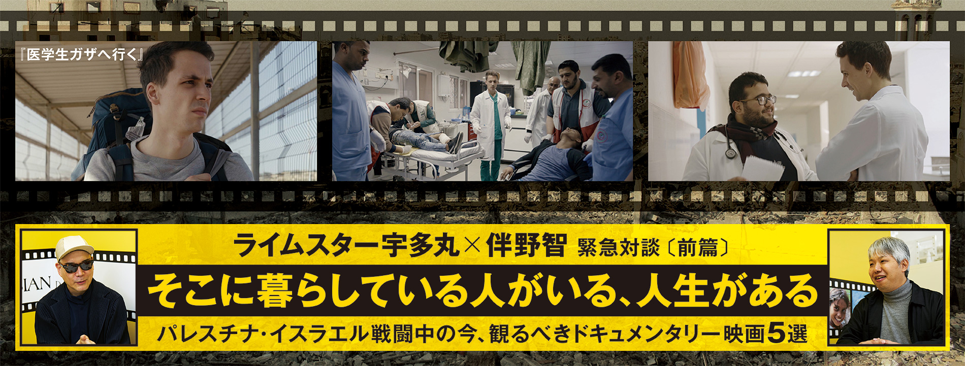 【宇多丸】 伴野さんと『ドキュメンタリーで知るせかい(仮)』という本をこの秋からずっと作っているのですが、その最中に、皆さんご存じの通り、パレスチナ・ガザ地区を実質的に統治していたハマスがイスラエルを急襲(2023年10月7日)、それを受けてイスラエル軍による大規模な報復が始まり……民間人を含む犠牲者が大量に生じる、とてつもない人道危機が今まさに進行中、ということになってしまっているわけです。僕自身、パレスチナ/イスラエル間の紛争の構造や歴史、その中で特にやはりパレスチナ自治区の人たちが長年大変な目に遭い続けてきたことなど、頭では理解しているつもりでしたが、今回のことで、遅まきながらですが改めて、ちゃんとこの件について学び直して、考えてみようと思いまして。たぶん世界的にも多いと思うんですよね、今、その感じのモードになっている人って。ひどい状態も慢性化するとつい「そういうもの」として流しがちになってしまうもので、パレスチナ/イスラエルの問題についても、正直ちょっとその傾向があったと思うんです。特に日本だと、やっぱりアメリカ発の報道や情報がどうしても多くなりがちだから、どちらかと言えばイスラエル寄りの見方で、「ハマスはテロリストで、それを掃討する戦いなんでしょ」とシンプルに考えてしまっている人も、ぶっちゃけ少なくないかもしれない。実際にはそんな単純な話じゃないんだけど……。